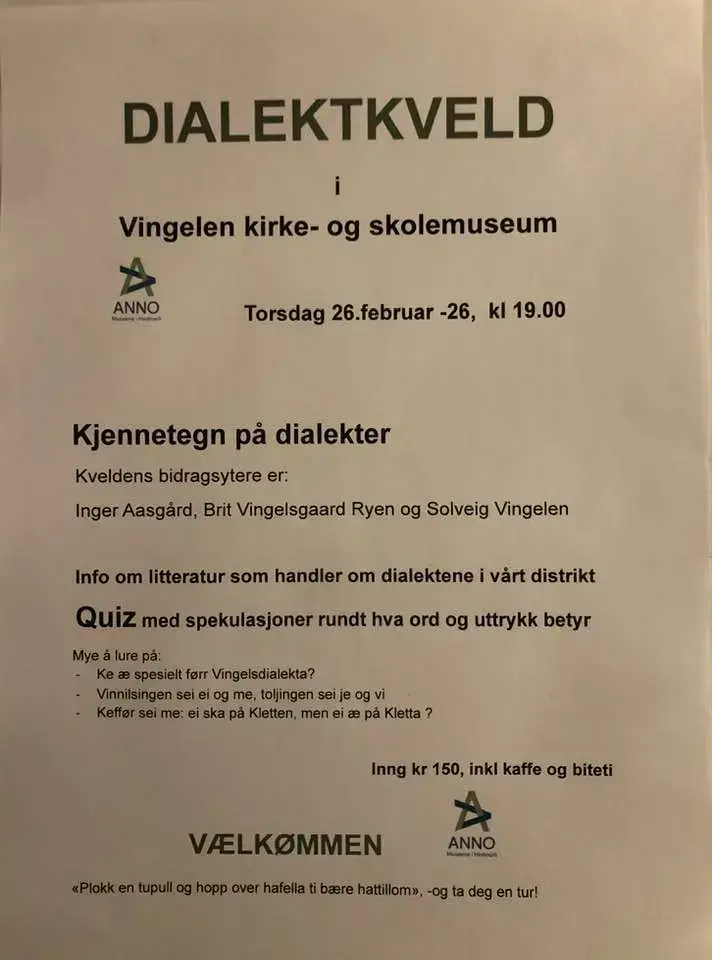 DialektkveldNB! Arrangementet har funnet sted Vingelen kirke- og skolemuseum 26. feb. 2026 19.00 1/1 Åpne eller lukk bildetekst